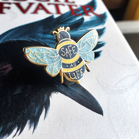 Calling all Raven Cycle fans! This one is for those who call Gansey their king: a fun little bee with his iconic quote "Safe as life". The bee also has a little crown in orange (for reasons) and the ley lines in its wings!