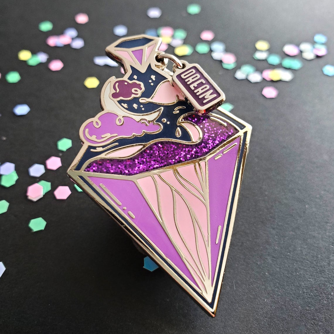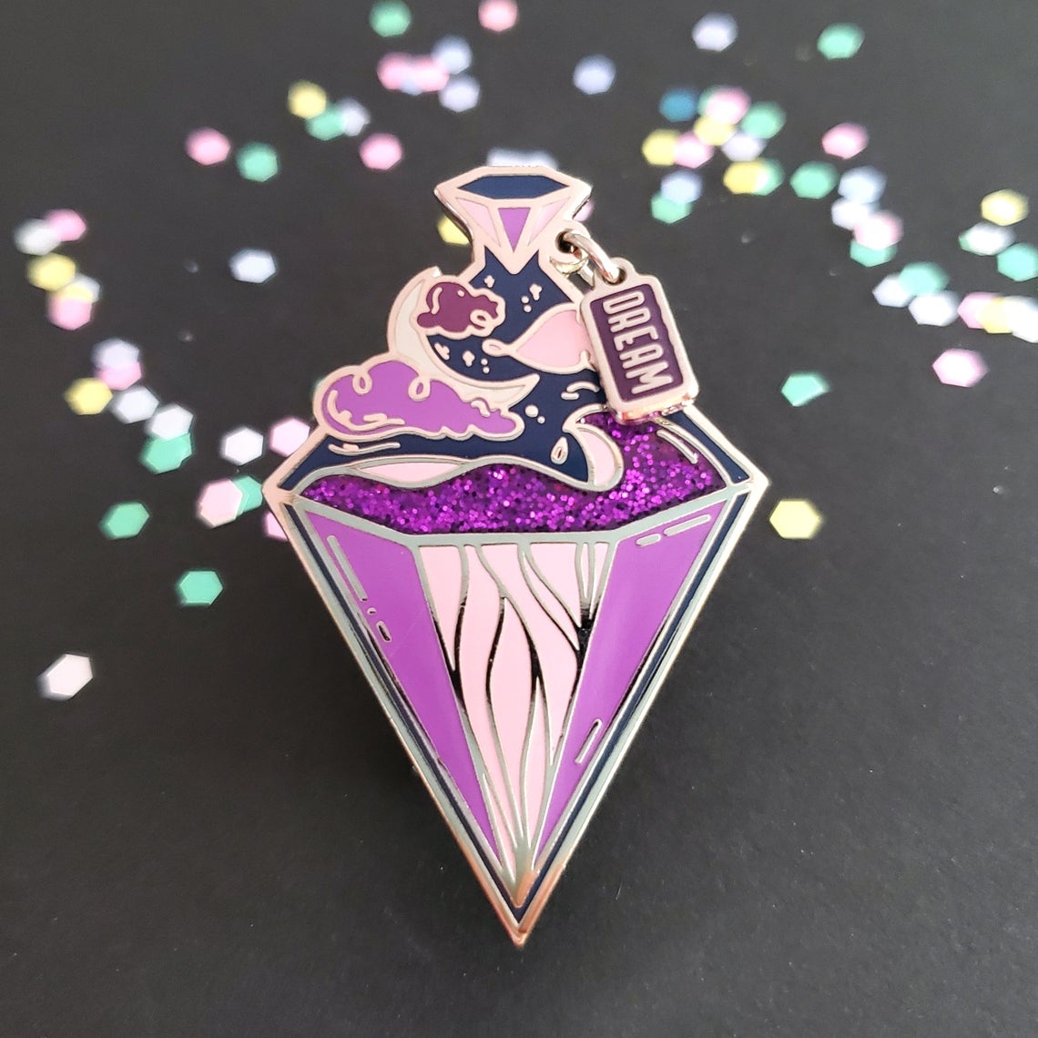 Calling all dreamers! Get lost in the stars and the magic of the night sky with this beauteous enamel pin (one of three dainty potions now available in our shop). It features a diamond-shaped bottle filled with magic and labeled with a dangling tag—all in dazzling silver.