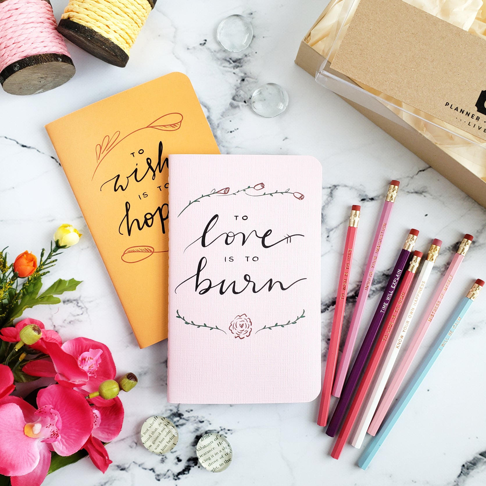 · A Journal — with a blank interior and a soft pink exterior, featuring the quote 'To Love is to Burn.' Measures 5" x 8".
