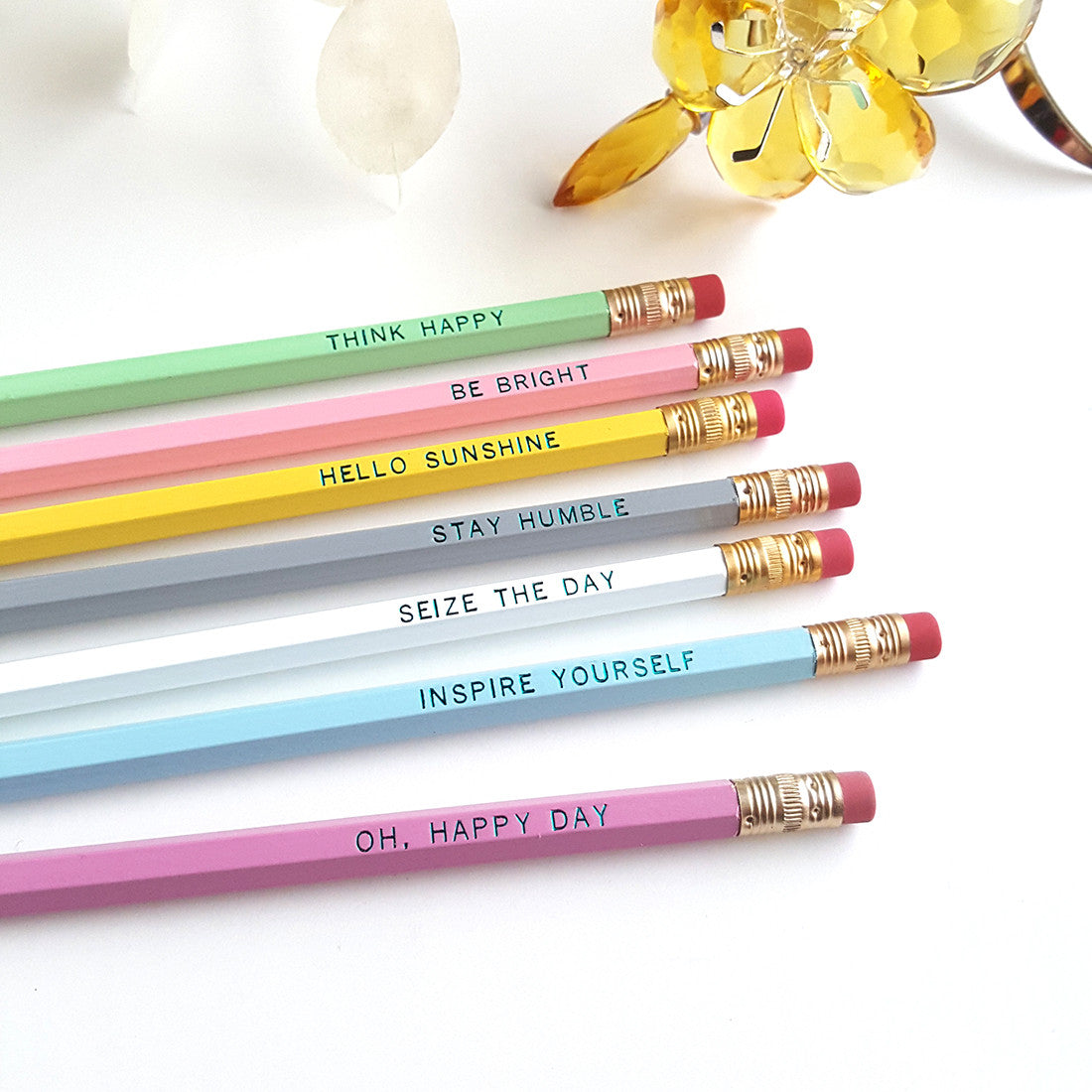 We picked out the finest pencils, our favorite quotes, and imprinted them by hand. The shimmery foil on pretty pastel shades—what's not to love? The pencils are hex, which won't roll of your desk and really lend to that rich, nostalgic, cozy home feel, something round pencils can never achieve.