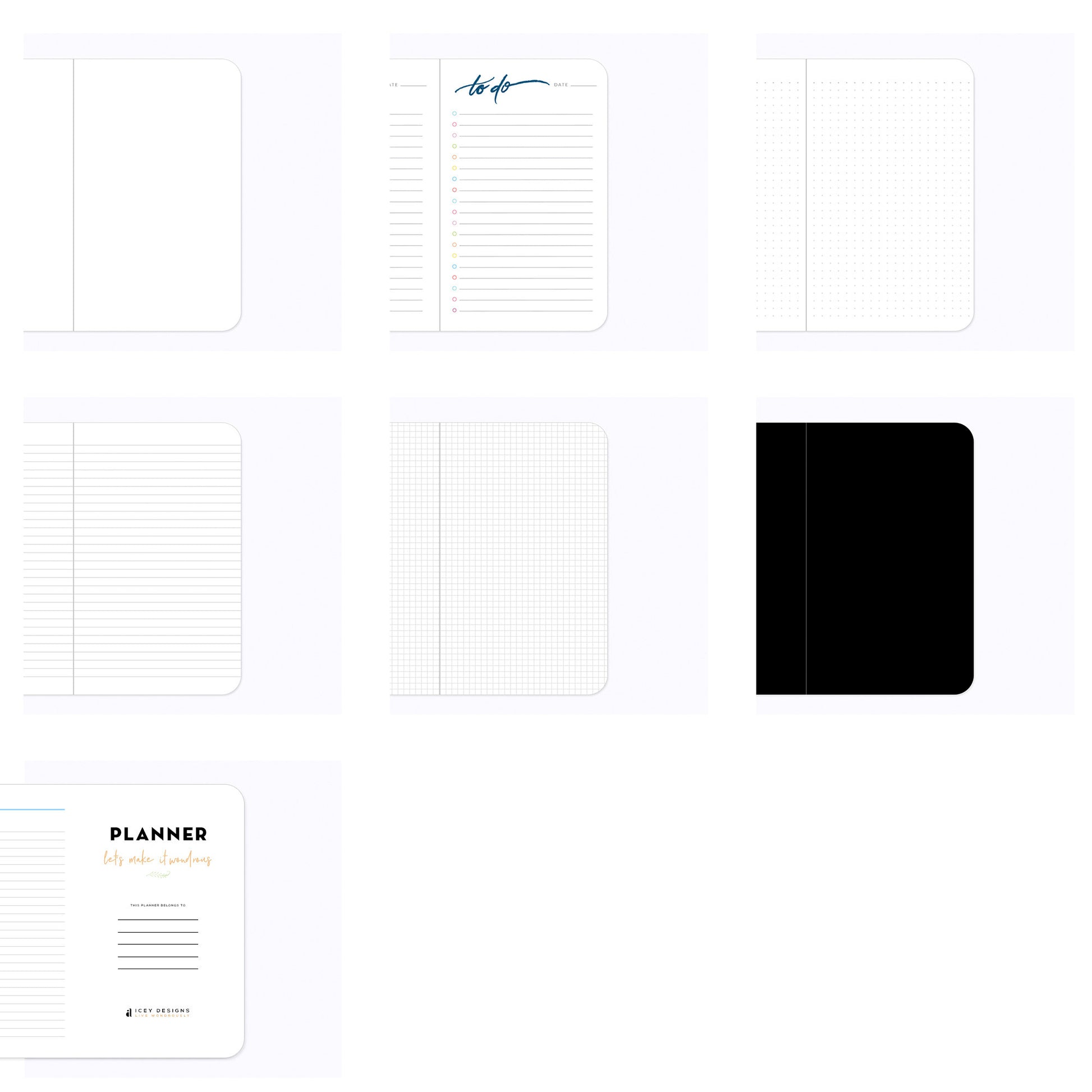 These interiors feature 80 pages of a uniform interior. For example: blank features 80 pages of fully blank sheets to let your imagination run wild! If you would like a planner interior, select the Planner.
